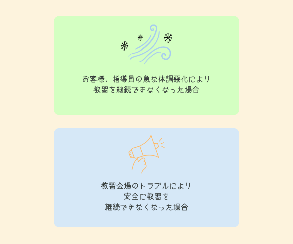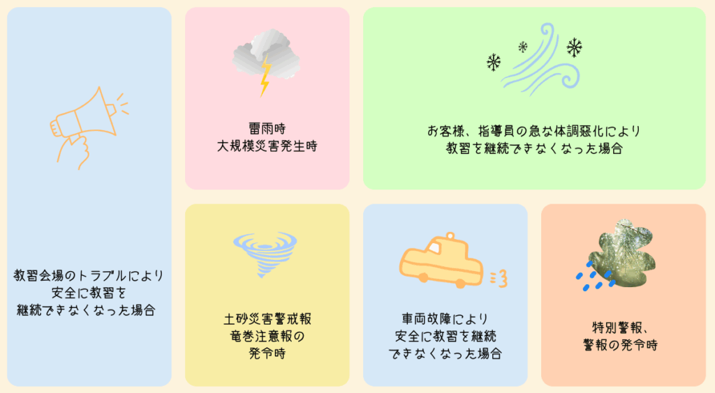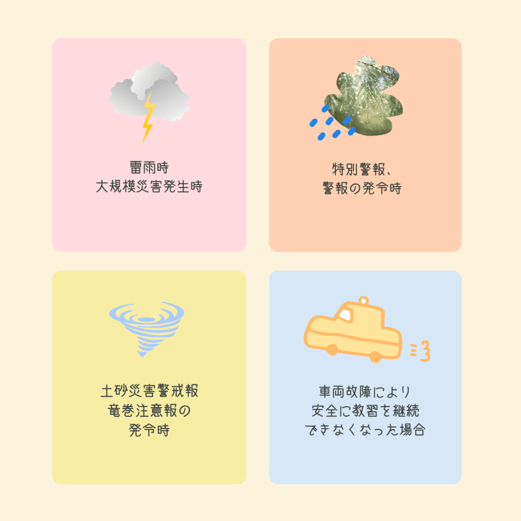 タイヨウライディングスクールではお客様の安全を確保する為以下の場合は教習を中止させていただきます。