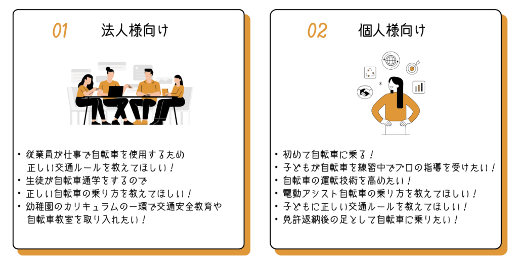 ※自転車に慣れ、より効果的な教習をご提供するため、自転車を所有されているお客様へはお客様の自転車で受講されることを推奨しております。